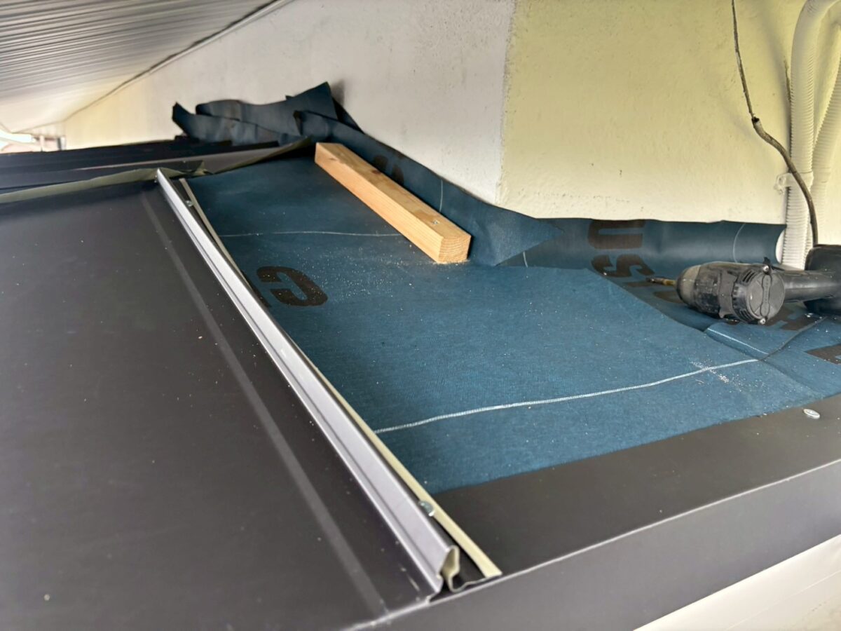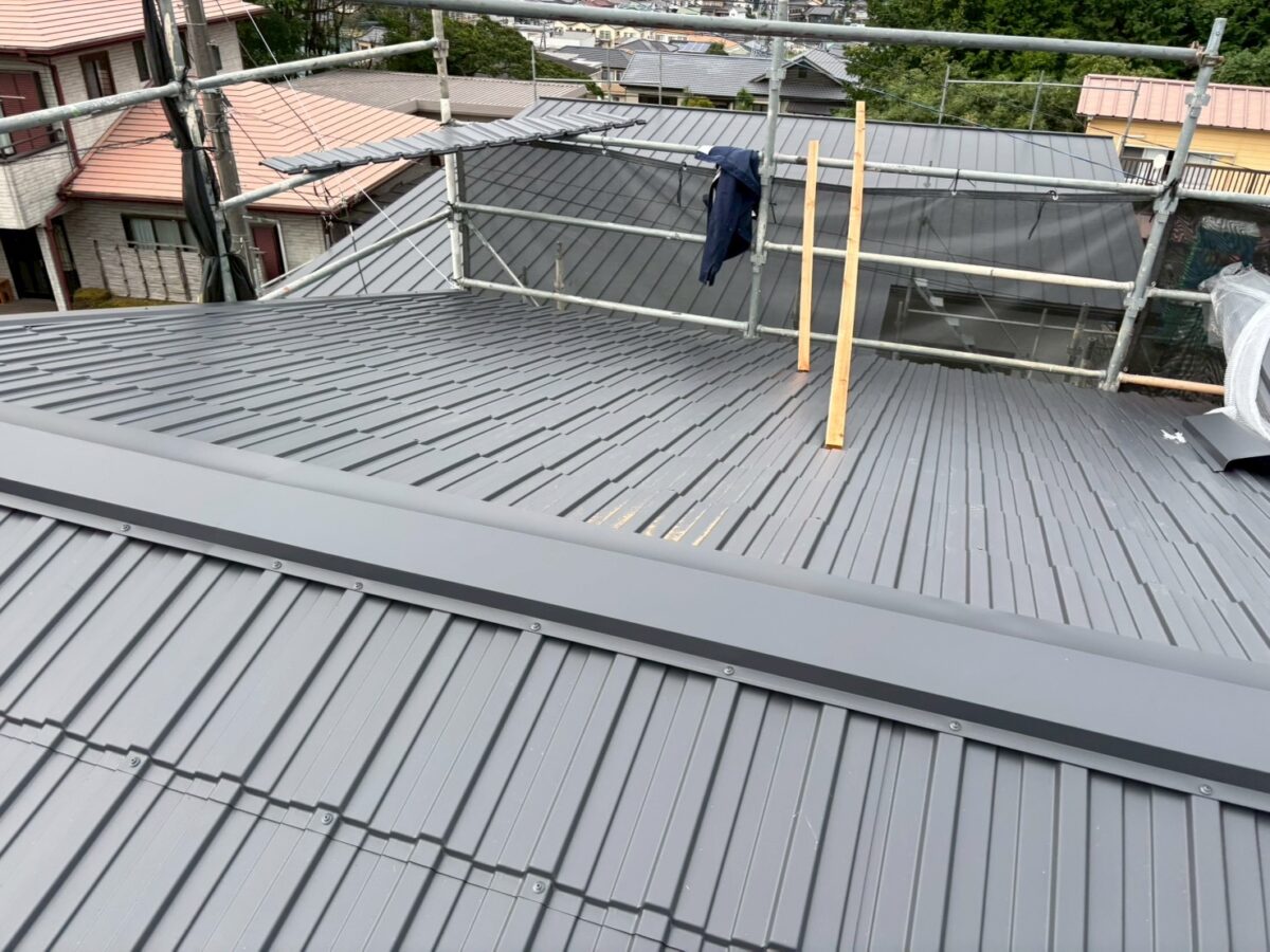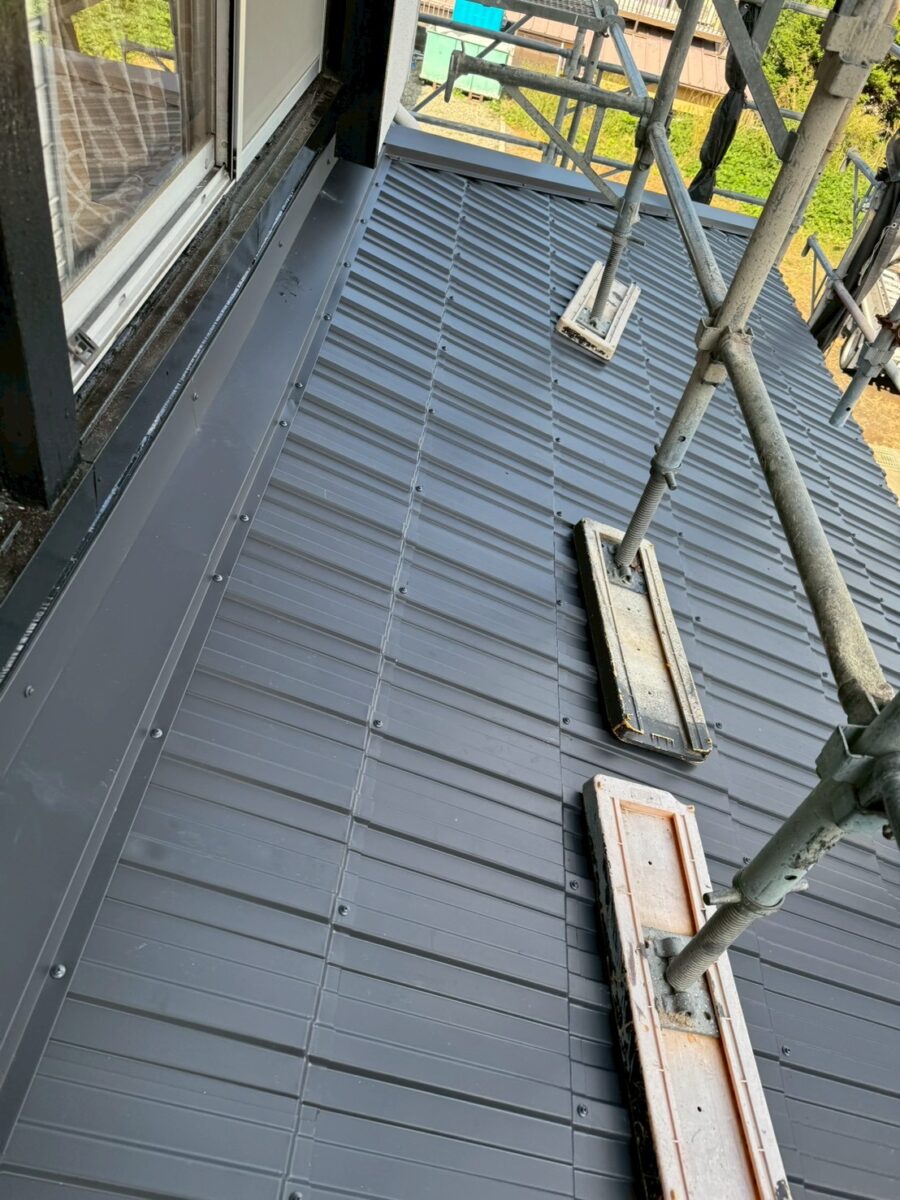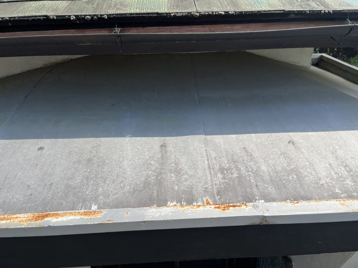 玄関ポーチは元々、内樋といってパラペットの中に板金で箱樋を作っているタイプでした、これは雨漏りやゴミの詰まりが起こり易いので、屋根の形を替えて外側に雨樋を取り付けるやり方に変更致しました、屋根材は同じレクトプルーフを使いたかったのですが勾配が低いので立て葺きを施工いたしました。