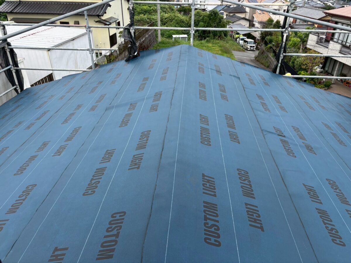 今回はマックス建材さんのレクトプルーフでの施工となります、今回は全体的に雨漏りしてる感じで現場調査の時も歩いてみて下地の柔らかさが分かったので合板を貼り垂木を狙って65mmのコーススレッドと言うビスでガッチリ固定します、現場の初日に職人が歩いていたらズバッと屋根に穴が空いた位でしたが、もう大丈夫です、大屋根と下屋根と施工致しました。