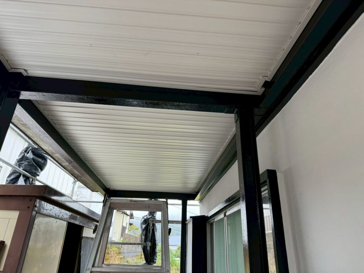 雨漏りにより腐食してしまった部分を取り除き垂木からガッチリと補強し軒天下地や破風板、鼻隠し板金と軒天板金を施工しました、バルコニーの裏側は当初塗装でお願いされていたのですが、仕上がりに不安があったのでサービスで角波板金に変更いたしました、最後に雨樋を取り付けました。