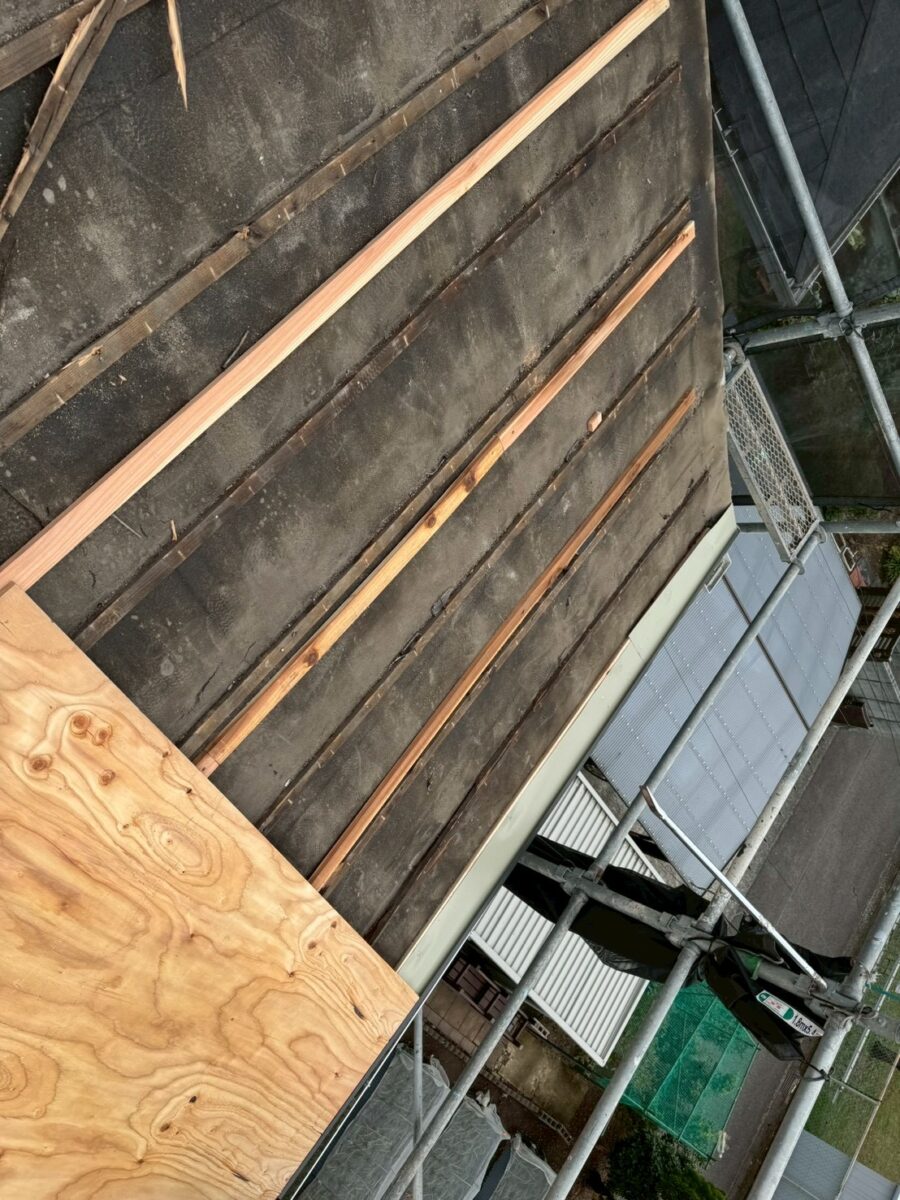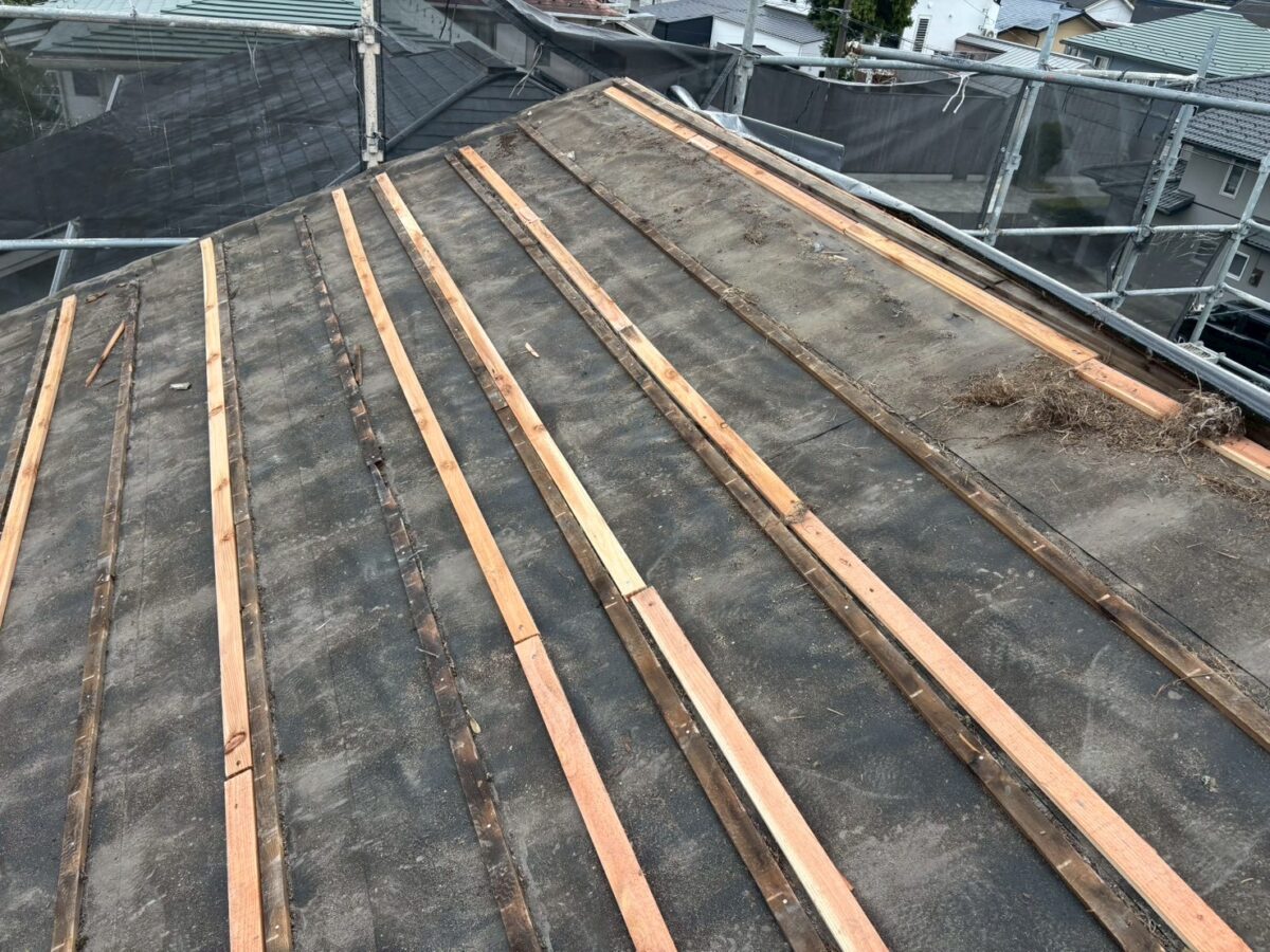私達は元々のルーフィングと瓦桟は取りません!元請けが大工さん系のリフォーム会社さんはコレも全部撤去する事が多いのですが私達は絶対に取りません、処分費の節約もあるのですが逆に瓦桟と同じ厚みの木材を打ちましして合板を貼ります、コレで空気層が出来るので断熱効果のアップと突然の雨でも大丈夫となります、最後の画像のように合板が外に出る部分には予め板金を取り付け下から見ても合板が見えない様にもします。