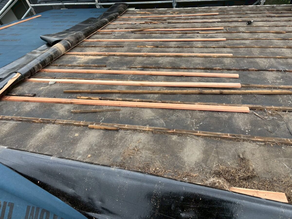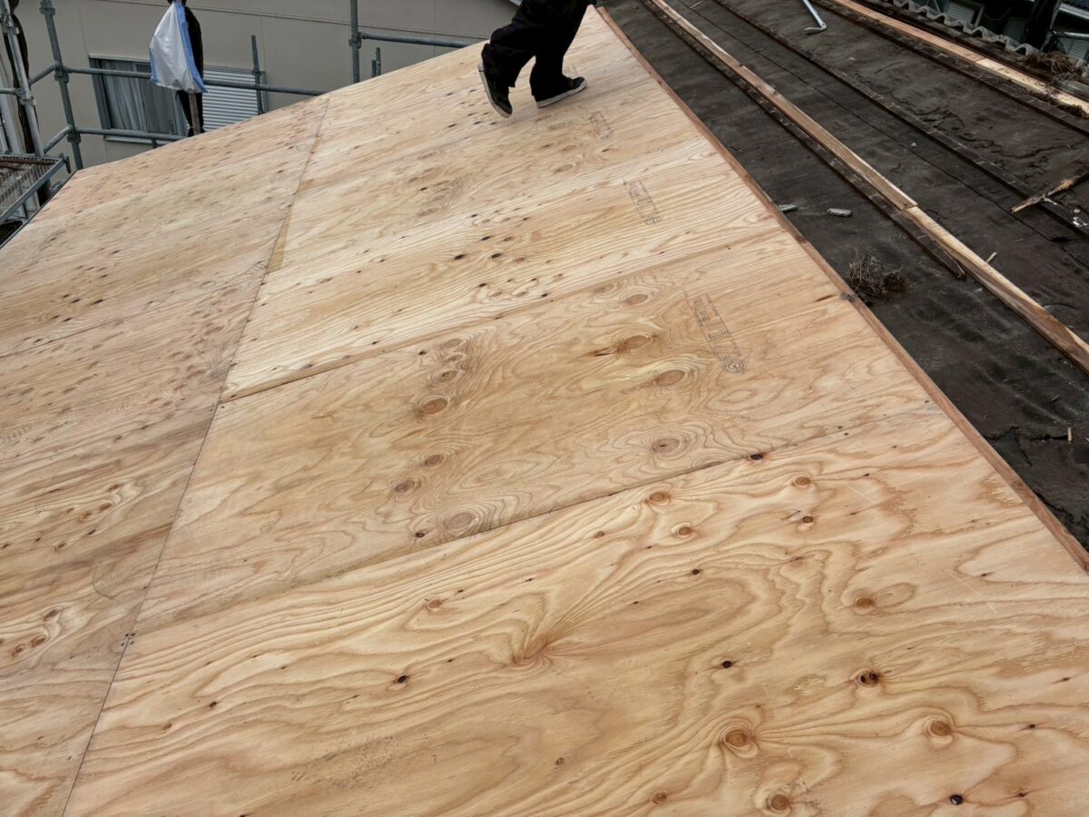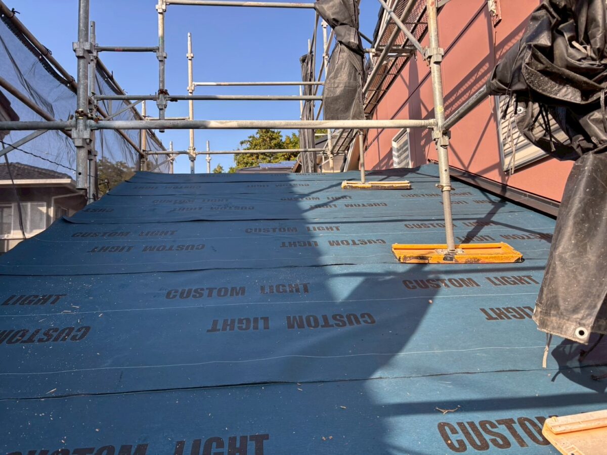 合板を貼ったらルーフィングを施工します私達は1日で全部バラしてブルーシートで養生して帰る様な事はしません、その日のうちにこのルーフィング迄終わる部分しかバラさず必ずルーフィング迄やって帰りますのでブルーシートは使いません、出来なかった面は最後の画像の様にルーフィングを重ねて帰ります。
