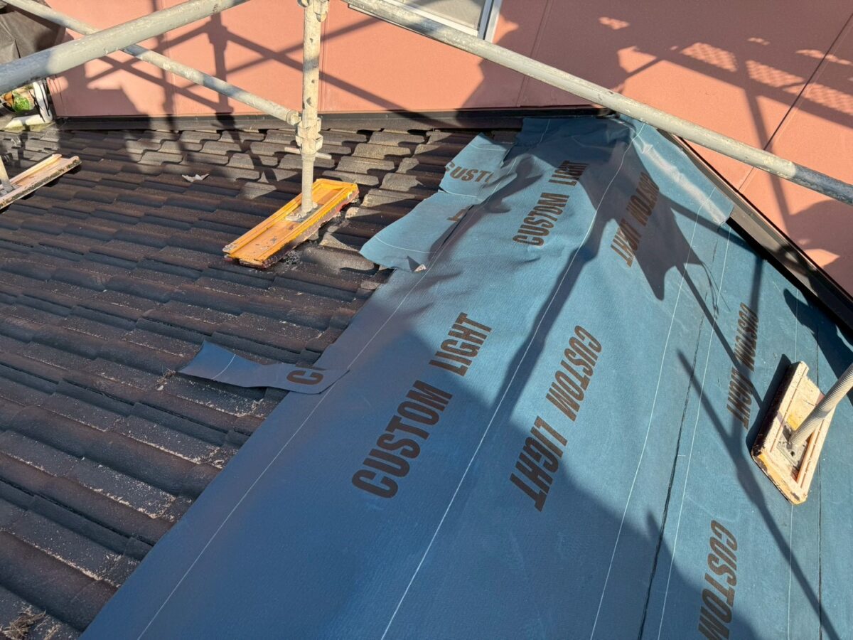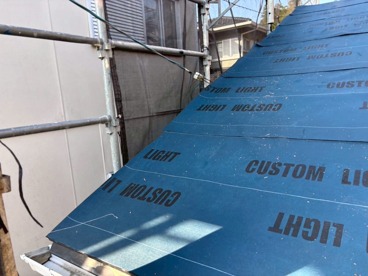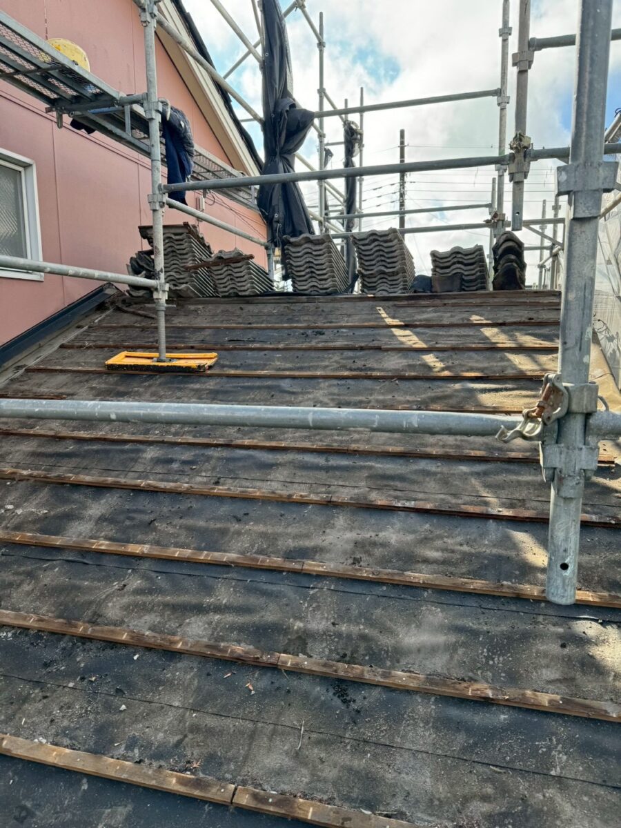合板を貼ったらルーフィングを施工します私達は1日で全部バラしてブルーシートで養生して帰る様な事はしません、その日のうちにこのルーフィング迄終わる部分しかバラさず必ずルーフィング迄やって帰りますのでブルーシートは使いません、出来なかった面は最後の画像の様にルーフィングを重ねて帰ります。