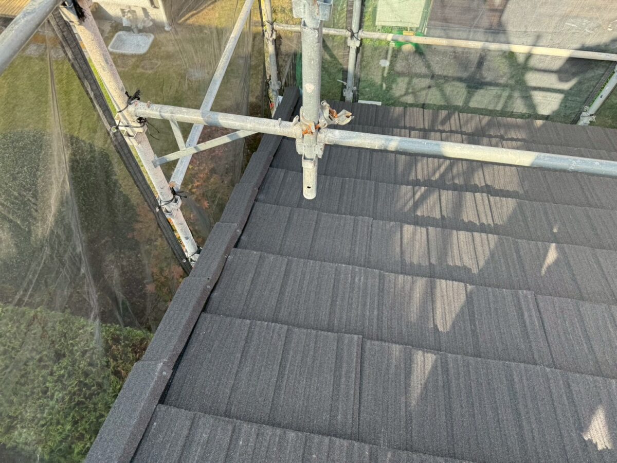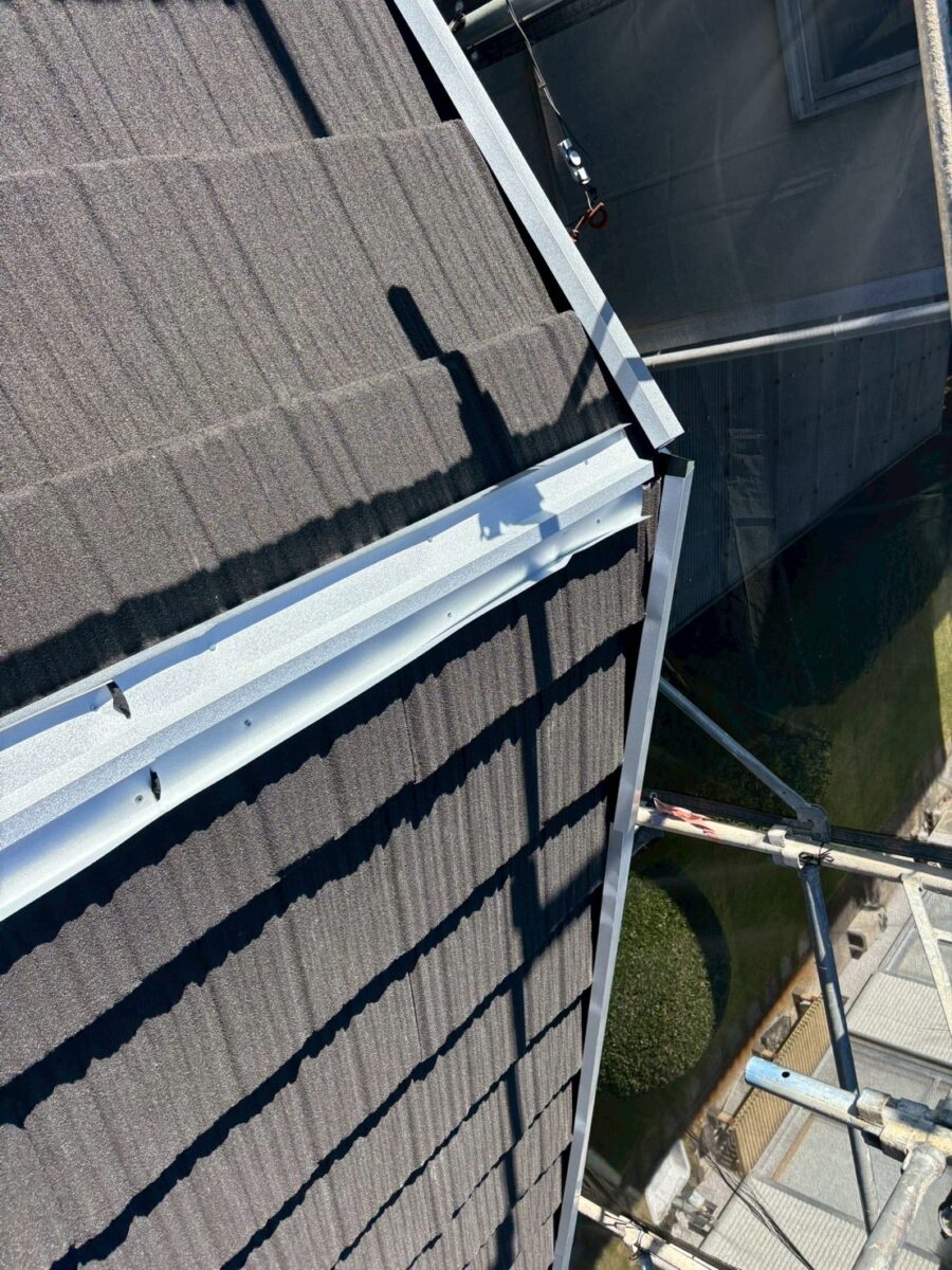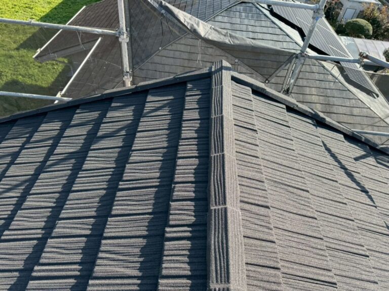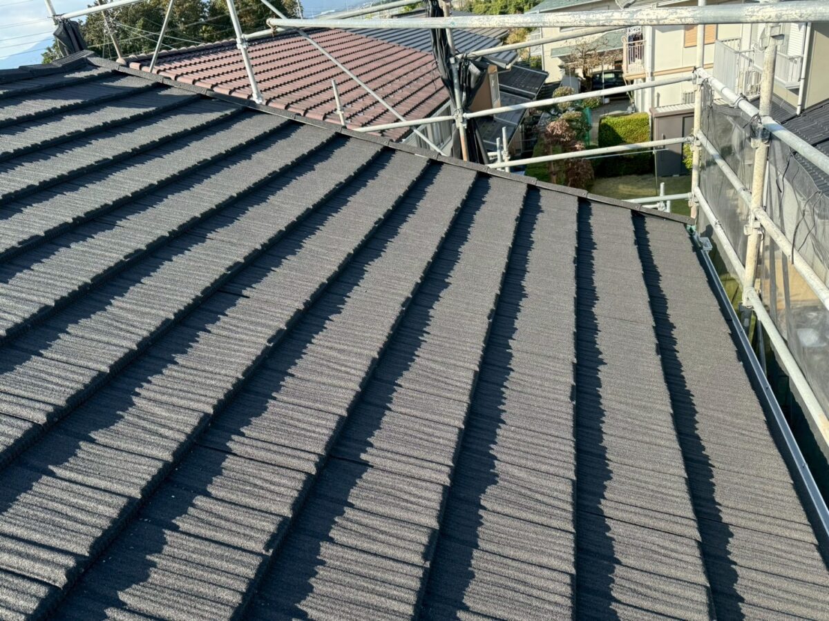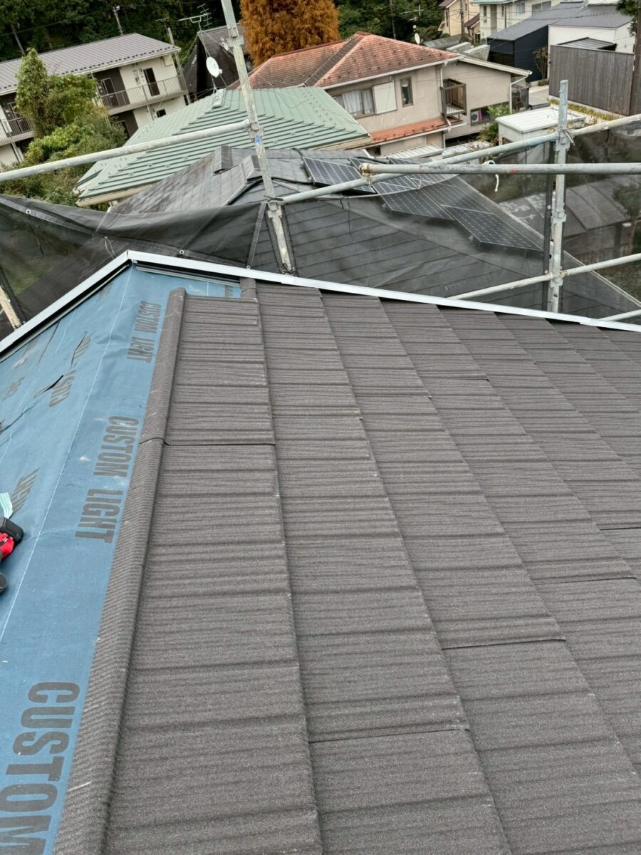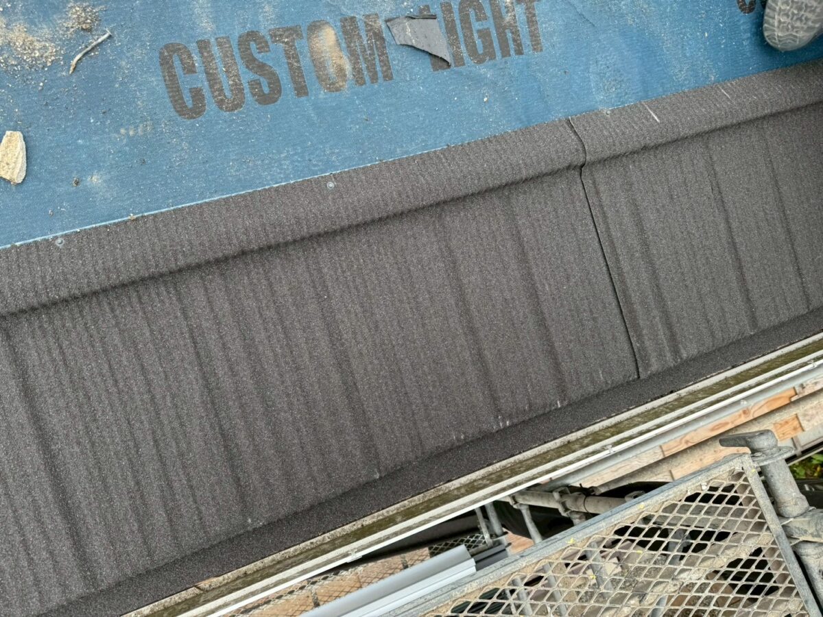 このコロナと言う屋根材は普段よく使用しているセネターよりも厚みがありケラバや棟の感じもコンクリート瓦に似ているのでコンクリート瓦からの葺き替えでも違和感なく使用する事が出来ますセネターよりも1割程料金は上がりますが高級感はそれ以上にあると思います、今回も無事に完工いたしました。