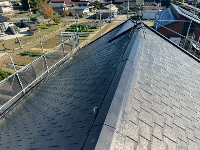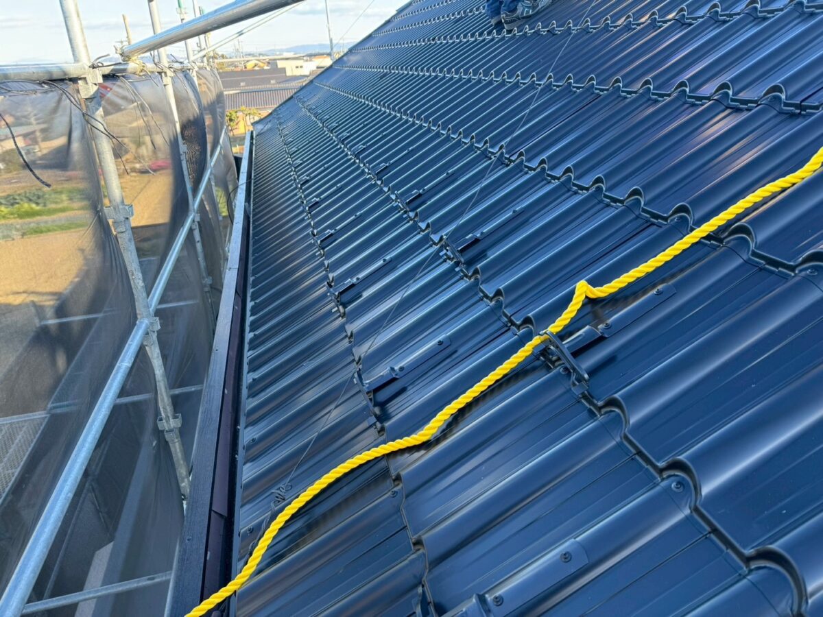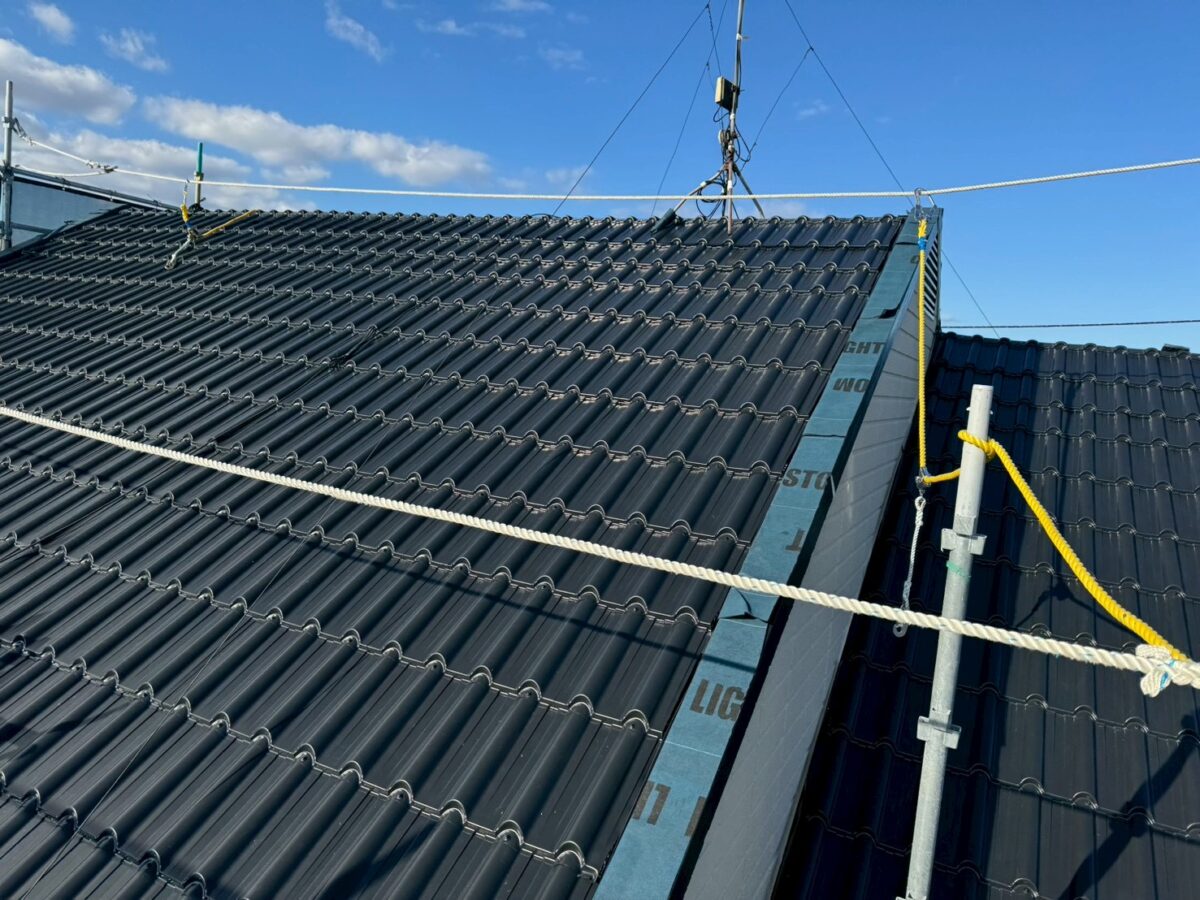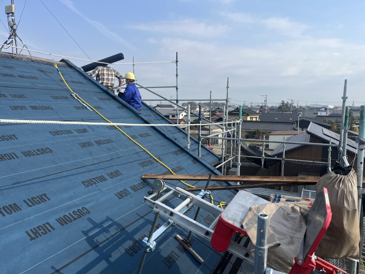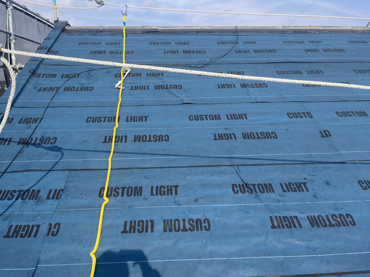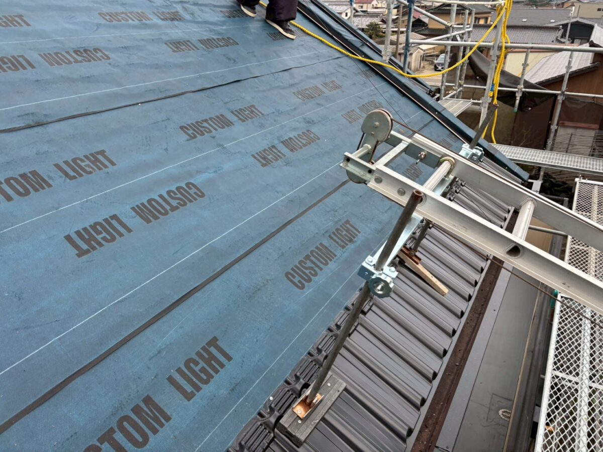今回の屋根は6寸勾配ですので屋根足場を組むかどうかのギリギリのラインです、元々の屋根が状態が悪いと滑って危険なのですが今回は普通に歩けるので安全対策の親綱と子綱を設置し子綱には安全帯を簡単に設置しスライド出来るアタッチメントのような部材を取り付けました、現場の職人からしたら、これすらも必要無いと言われてしまいましたが何かあったら困ると言う事で安全帯で安全対策をする様にお願いし、粘着層付きルーフィング貼りからスタートいたしました。