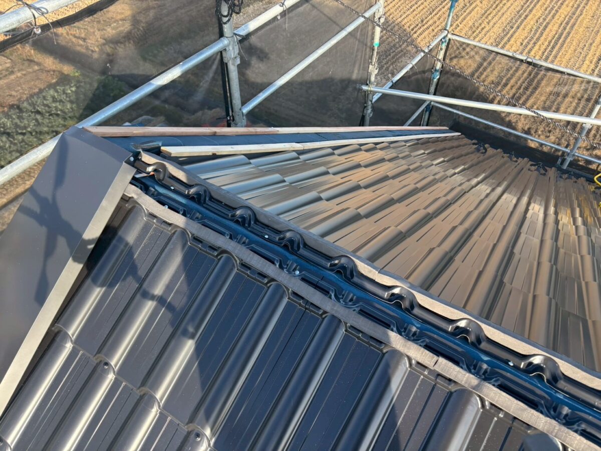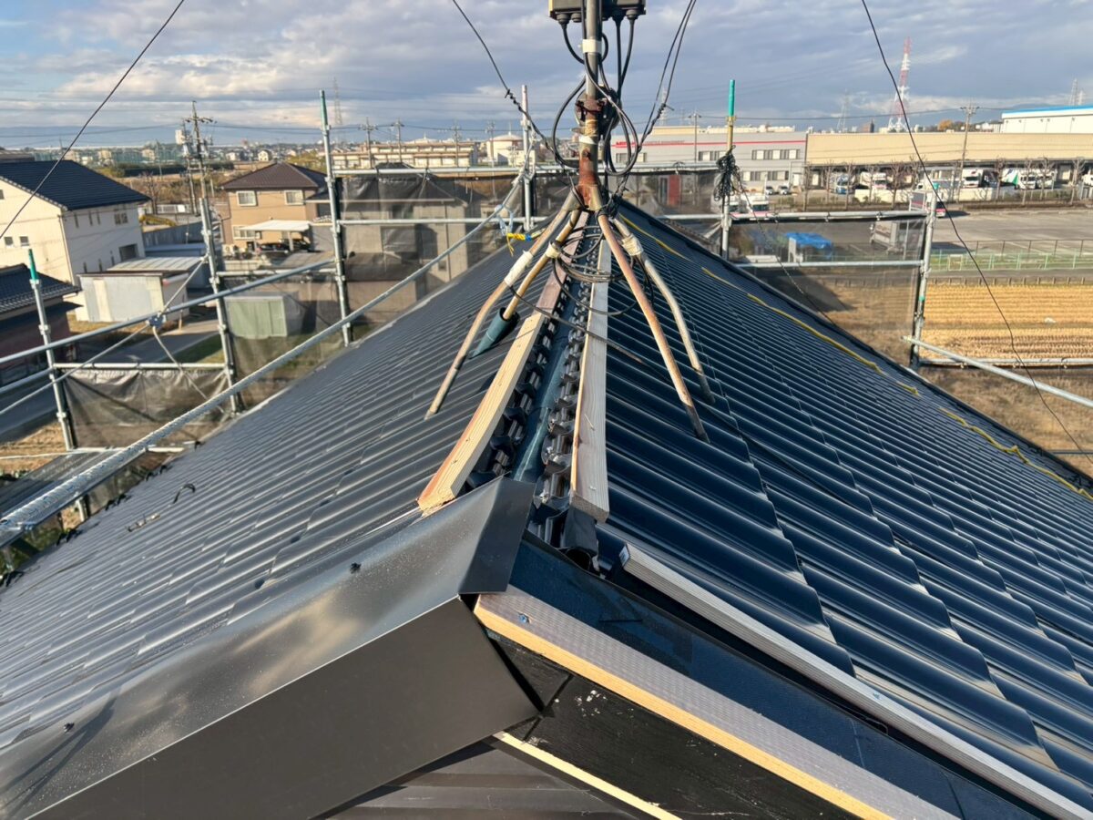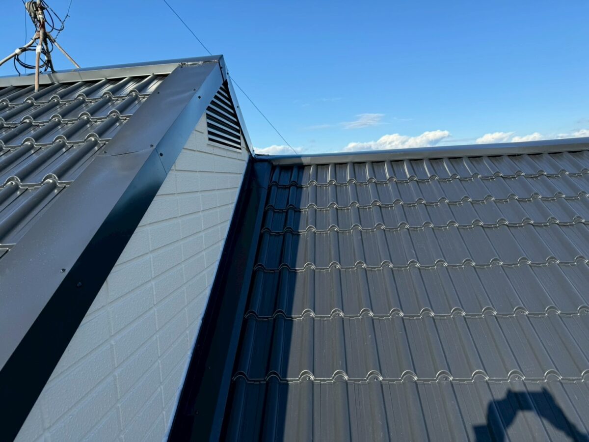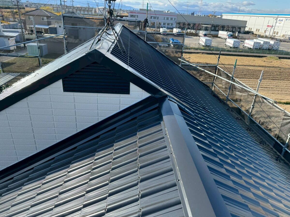 棟板金、ケラバカバー、雨押さえなどの板金役物を取り付け最後に軒先の雪止め金具を取り付け完成です、初めてマックスハイプルーフを施工してみての感想は立体感があるので洋風の建物に勿論合うのですが、純和風にも全く違和感なく格好良く収まる屋根材だろうと思いました、外壁塗装やコーキングの打ち替えは今回の現場は諸事情により省略させていただきます、ありがとうございました。