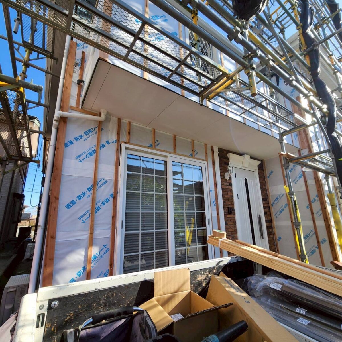 写真には写っていませんが、サッシ周りなどの開口部には必ずブチルテープを施工し、防水処理をしっかり行った上で、その上に下地材を留め付けていきます。