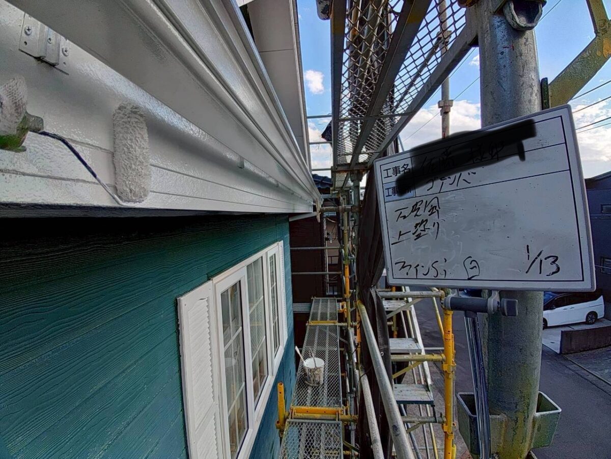 先に付帯部を塗装し、外壁を張ったときに自然に馴染むように整えていきます。
