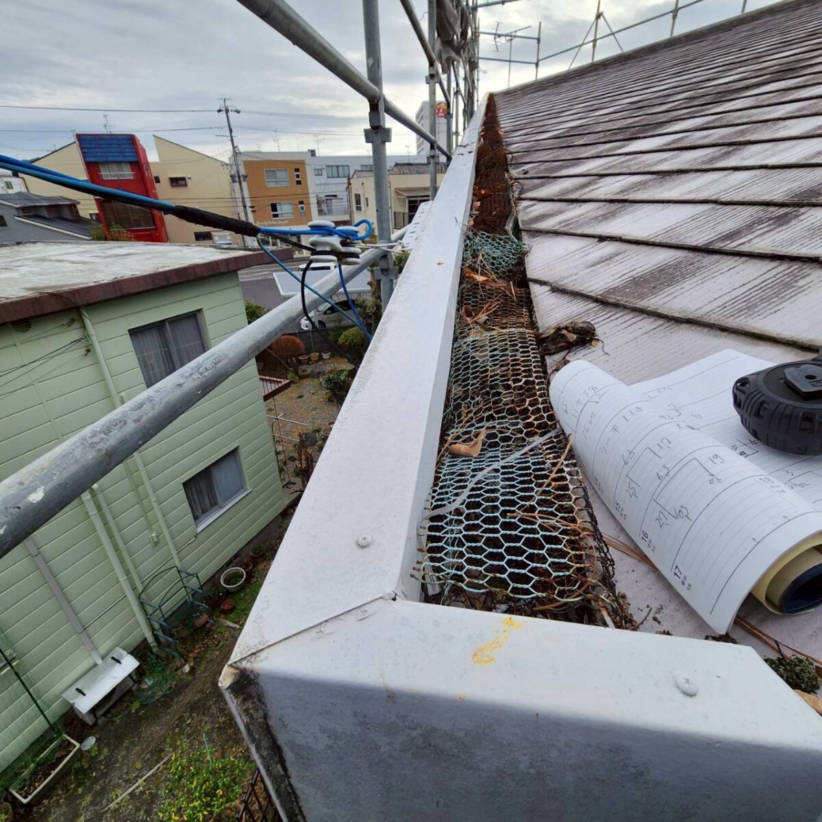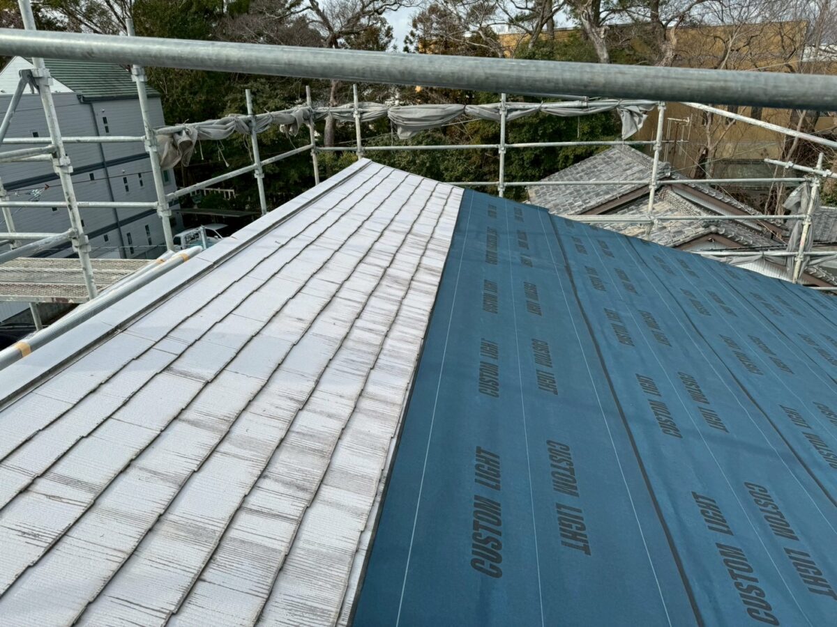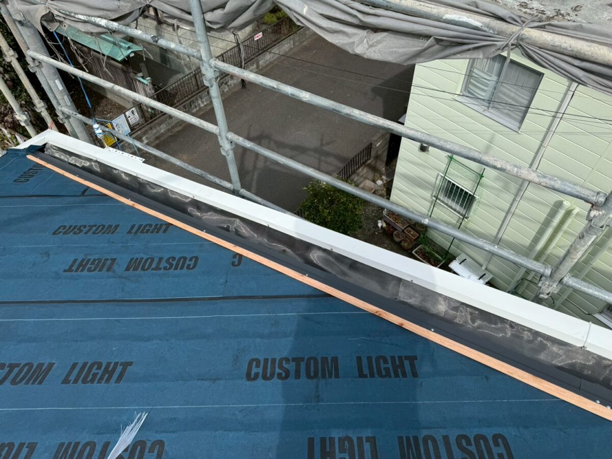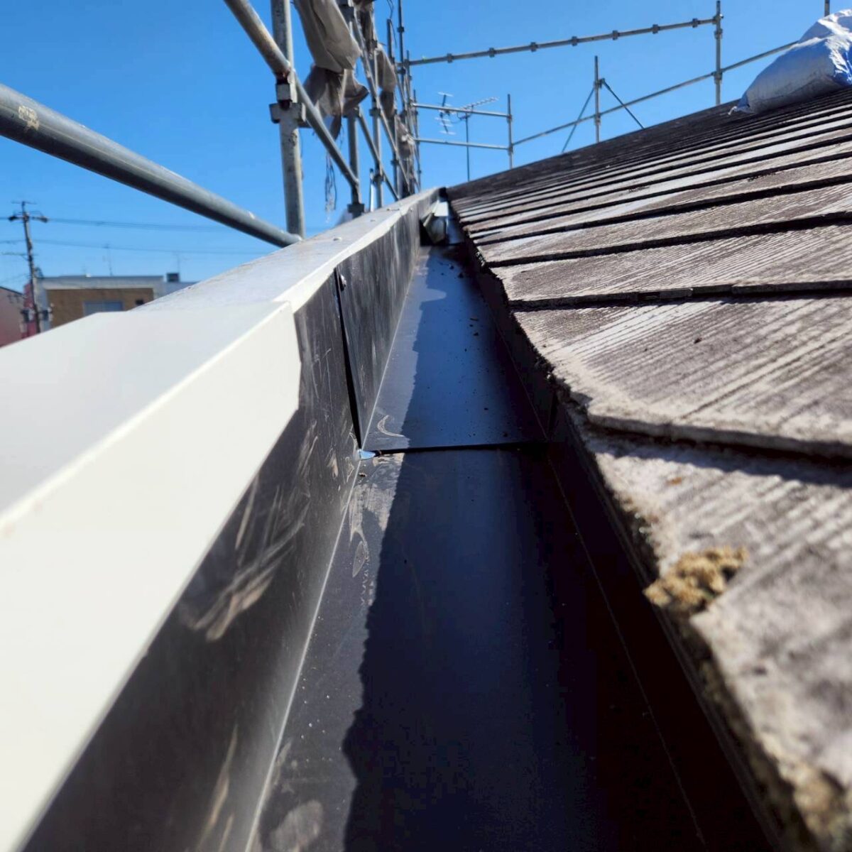 ルーフィング施工後は、箱谷部分の落ち葉対策。