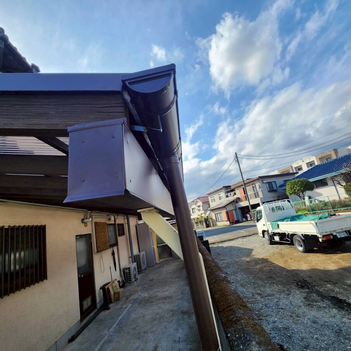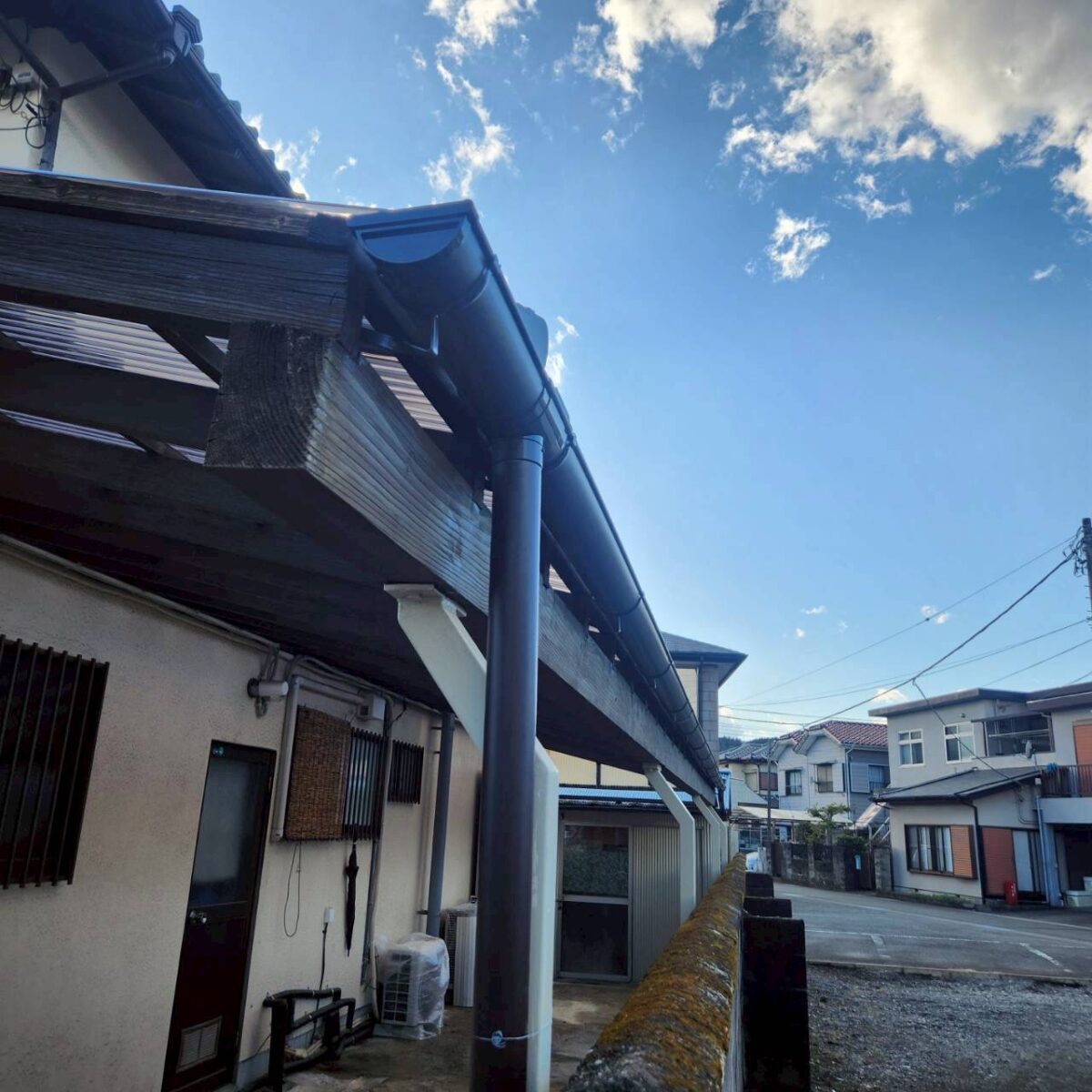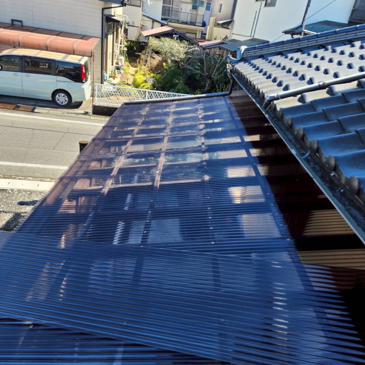 富士宮市 カーポートの雨どいが隣地ギリギリ 軒先カットとポリカ波板張り替え 物置屋根小波交換工事の施工事