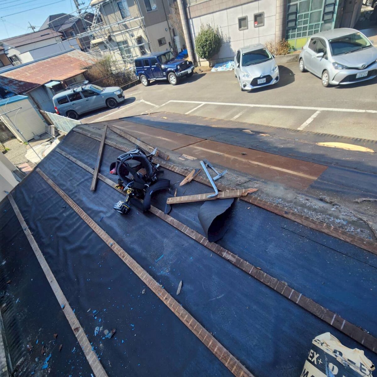 横桟を撤去したあと、新しいルーフィングを施工します。