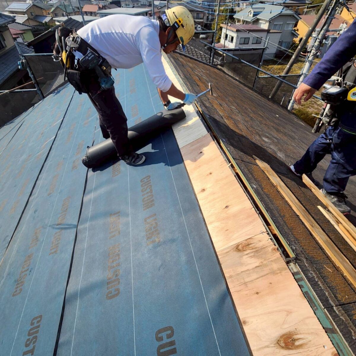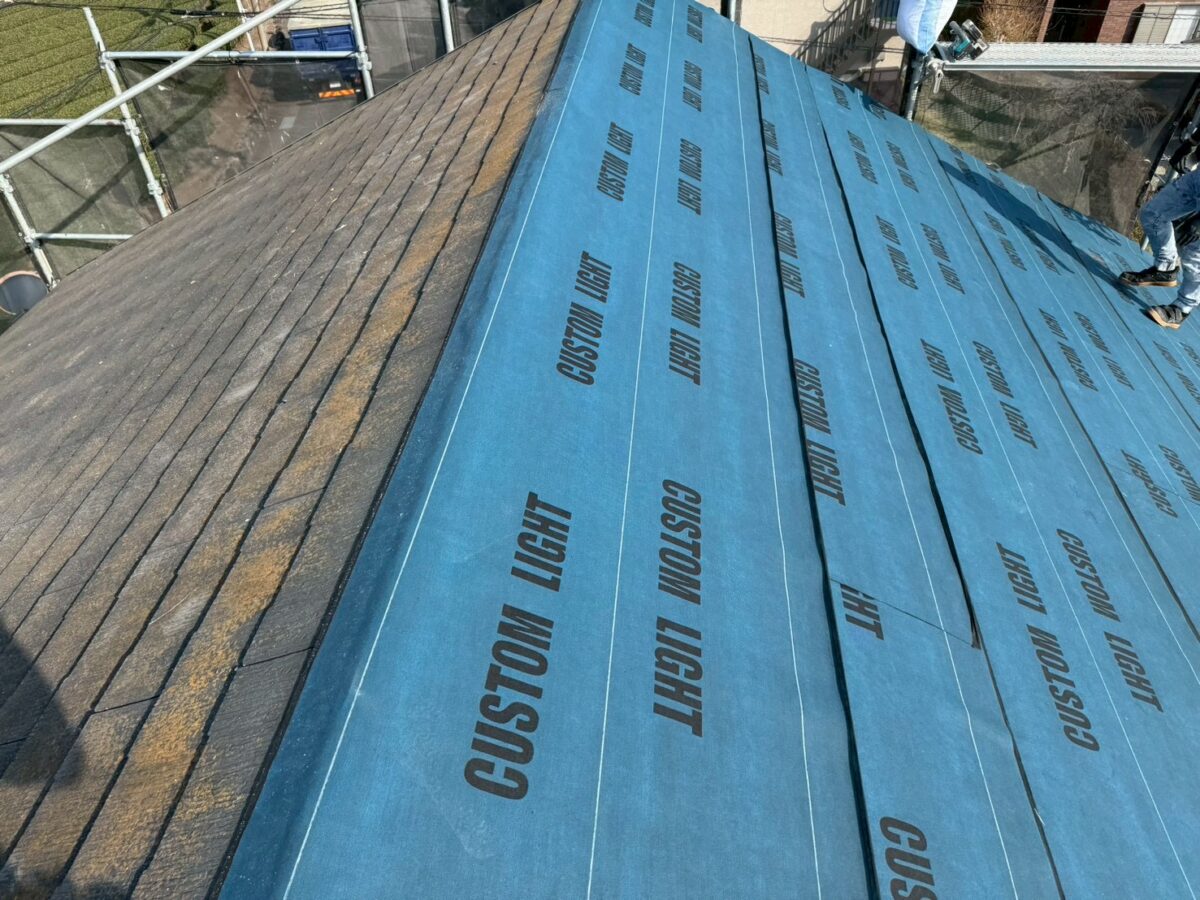 下地の交換を終えた後は、屋根材をばらした既存ルーフィングの上から、新しい下地を貼っていきます。