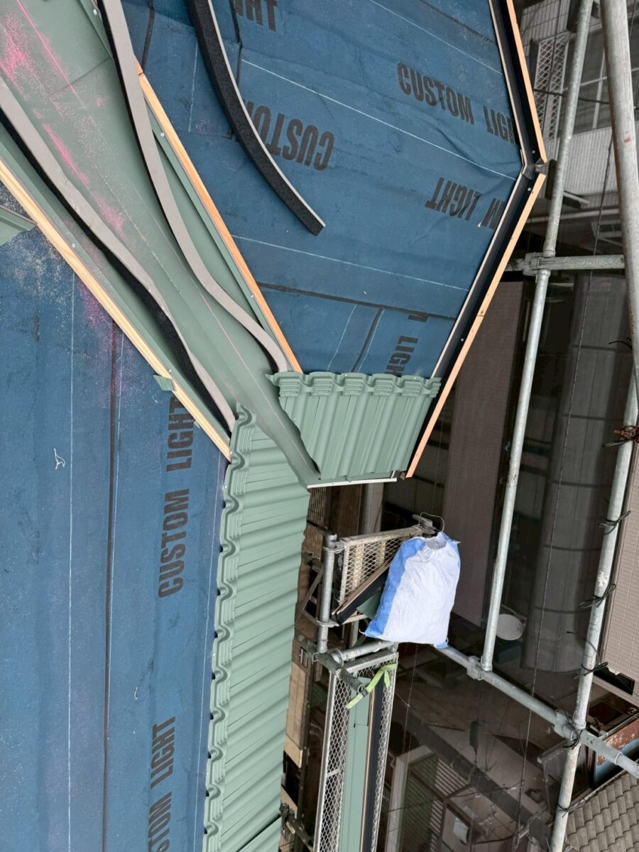 ルーフィングを貼り終えた後は、板金役物を取り付けていきます。板金役物には、屋根材を取り付ける前に施工するものと、屋根材を貼り終えた後に取り付けるものがあります。
