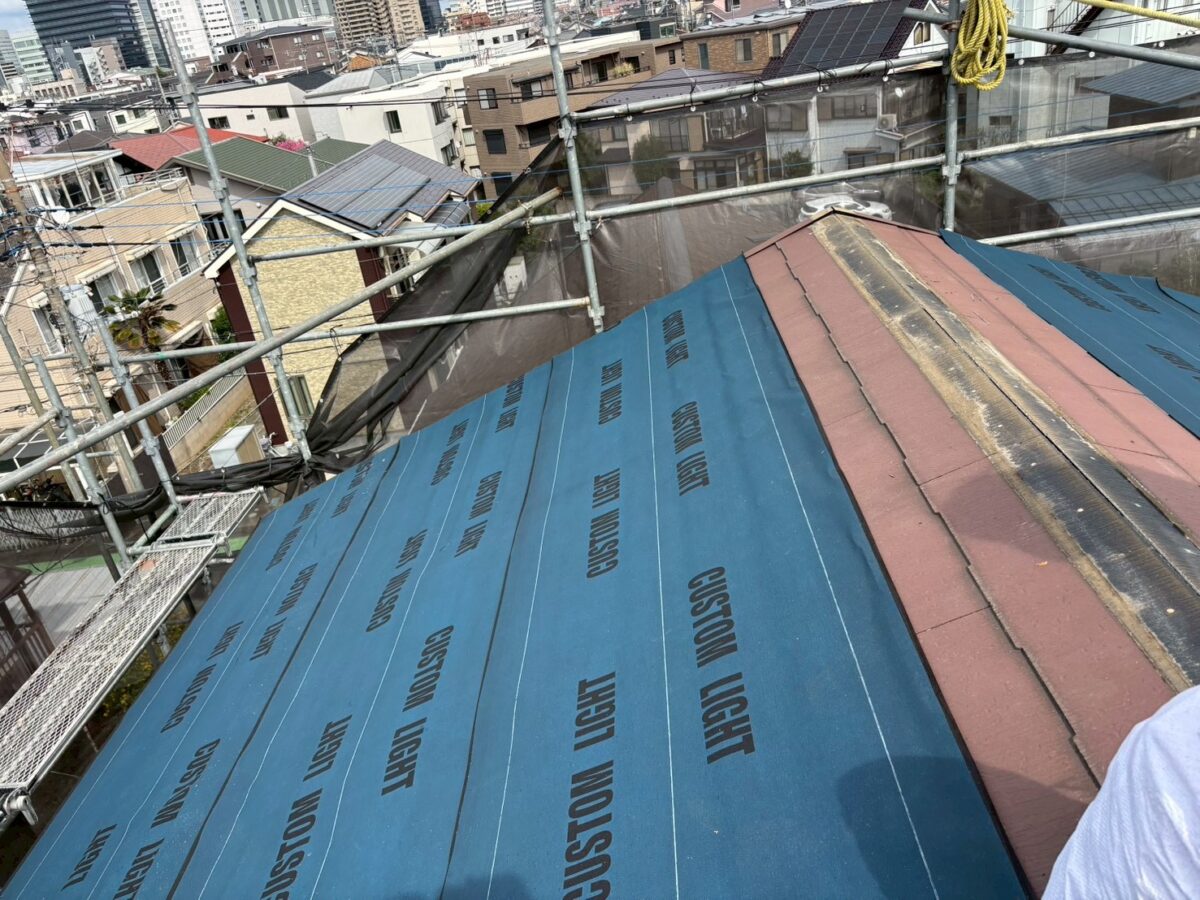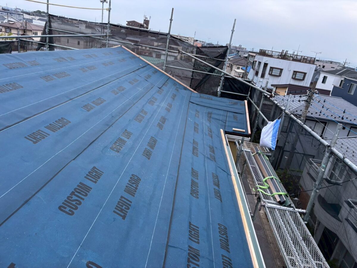まずは、粘着層付きルーフィングのカスタムライトを貼っていきます。このカスタムライトという粘着層付きルーフィングは、粘着力が強すぎず弱すぎず、とても扱いやすい、ちょうどよいバランスのルーフィング材です。