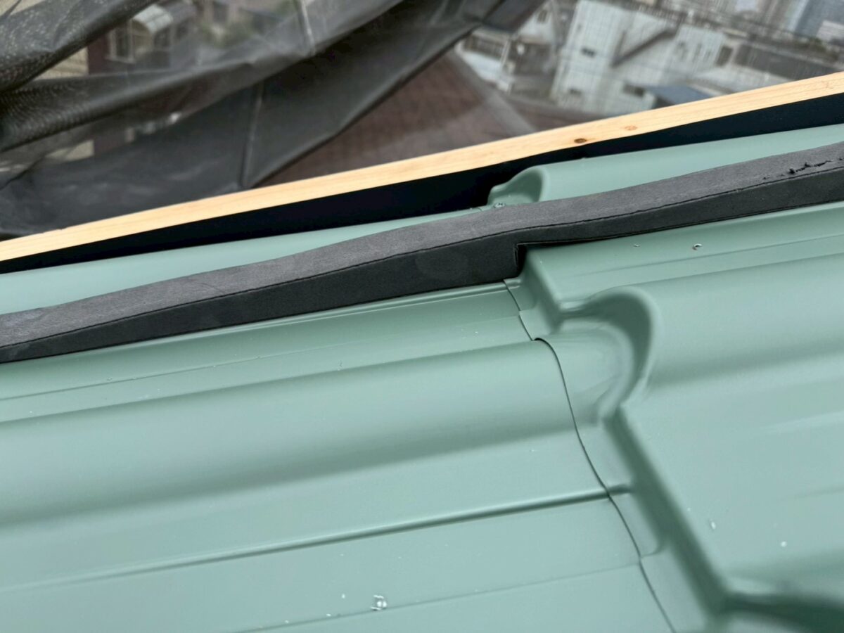 2階の大屋根の方も、最後に後付けの板金役物を取り付けていきます。ケラバ板金、棟板金、それぞれの部分には接着のためのケミカル面戸を下地に施工し、その上で役物を取り付けていきます。谷板金の部分もきれいにカバーを納めることで、見た目の美しさもしっかり維持されます。