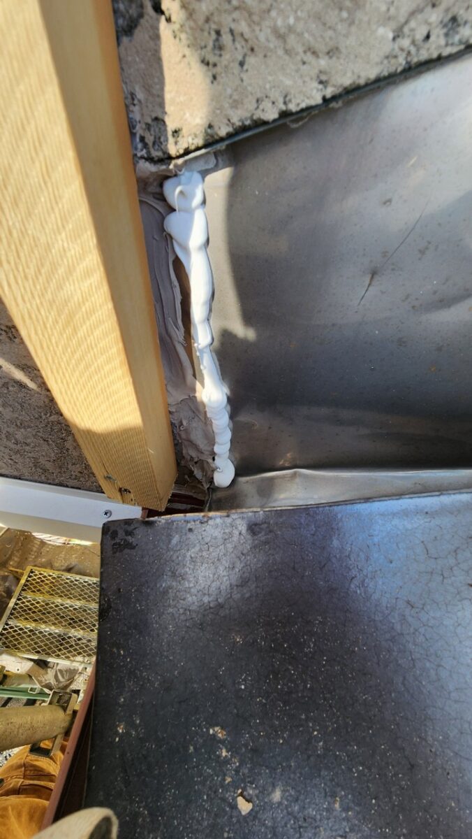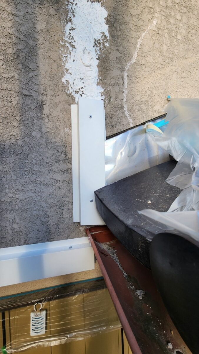 私達は外壁塗装の時には見た目だけで無く建物自体を長持ちさせる為に不具合が無いか、徹底的に勝手に確認してしまいます、今回もバルコニー裏に雨漏りの形跡があったので点検口を取り付け確認し、瓦屋根の捨て谷の付け根からの雨漏りを対処致しました、この場所はよく水が侵入しますので点検口を取り付けて確認する迄も無いのですが室内にも漏れた事があると言う事でしたので複数侵入の可能性を懸念して確認しましたがステ谷だけで安心しました、防水としてはコーキングで充分なのですが塗装が乗らないシリコンコーキングを使用する為に板金でコーキングごとカバーします、コレによってコーキング自体の寿命も長くなるし外壁と同じ色で塗装してしまえば違和感も少なくなります。